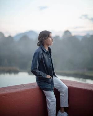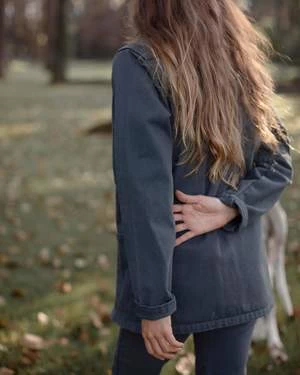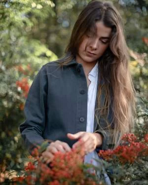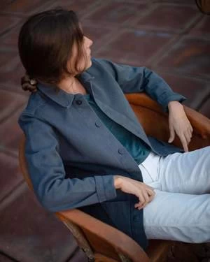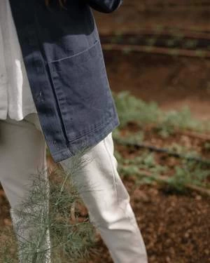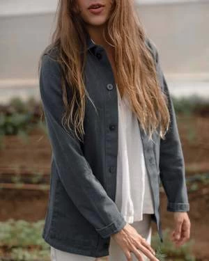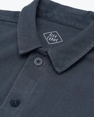 A deep blue canvas jacket with two front pockets and corozo buttons. Made in Los Angeles with washed American canvas.