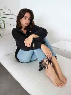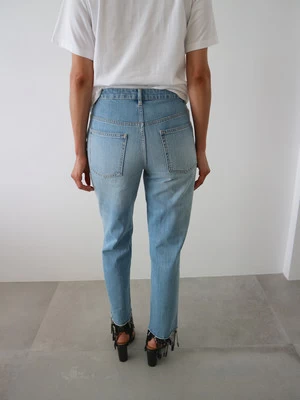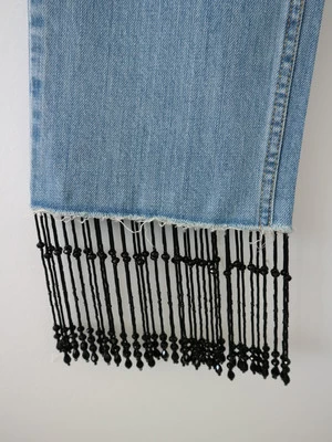 Distressed denim boyfriend-cut jeans get a fresh update with glass beaded fringe hem. Worn-in distressed denim. Semi high-waisted.