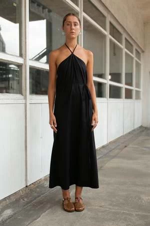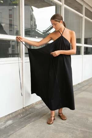 Halter neck with an open back. This dress is fastens with a wrap around tie and cane worn multiple ways