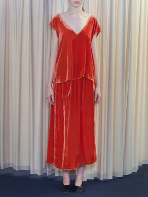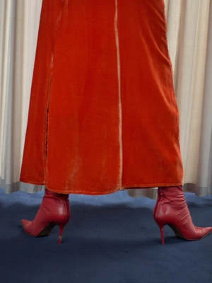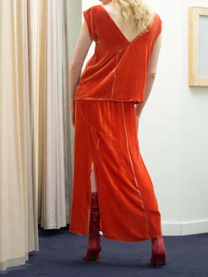 Velvet silk skirt, elastic waist and rear slit. Slinky with heels, casual with sneakers or heels.