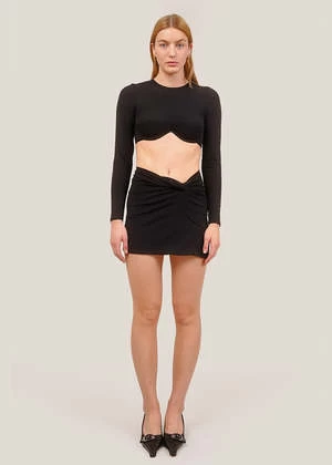 Black cotton jersey mini skirt with a flattering knot detail and twisted waistline. Slips on.