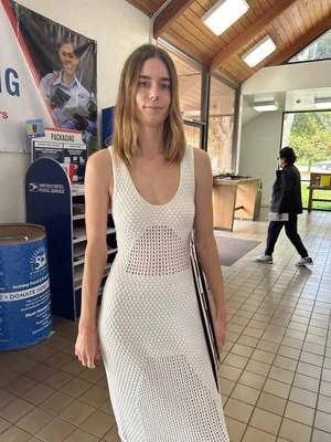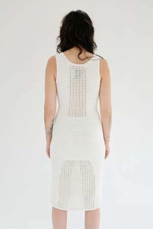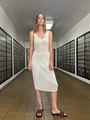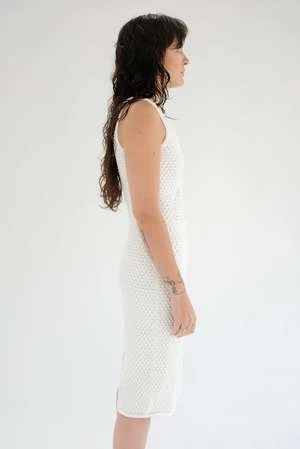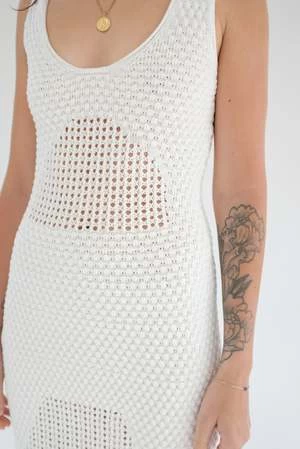 Gorgeous hand knit tank dress, with a unique mesh design details and texture, medium weight. Washable, 100% luxurious Pima cotton. Natural stretch and give from the knit, making it an easy fitting style that adjusts to your natural shape.