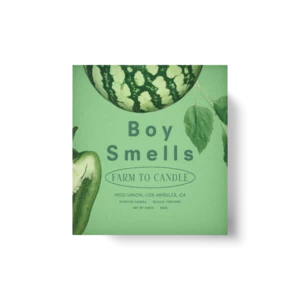 Undyed coconut and beeswax blend with braided cotton wick, in glossy, transparent green glass tumbler. Comes in embossed matte green carton. Mint green label. 8.5 ounces (240g). 3.4 inches (8.6cm) tall. Roughly 50 hour burn time.