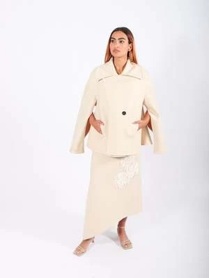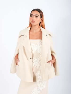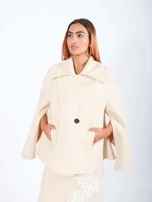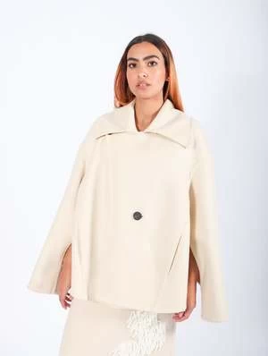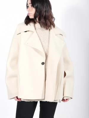 The Double Caban Coat in Ecru by Calcaterra is a stylish outerwear essential. Crafted from felted wool, this coat is double-breasted with dropped shoulders and a relaxed, oversized silhouette. Its cropped length ensures a fresh yet timeless appeal.