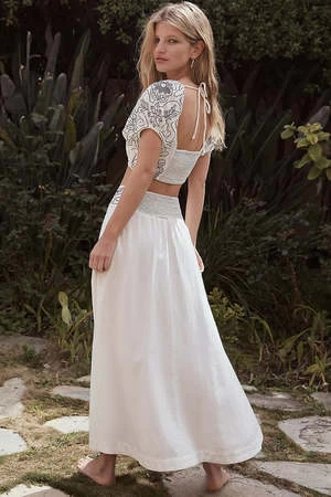 Stand out in this so special set featuring a stunningly embroidered, puff-sleeved cropped top with matching mid-rise maxi skirt for the ideal done-in-one style no matter the occasion.
