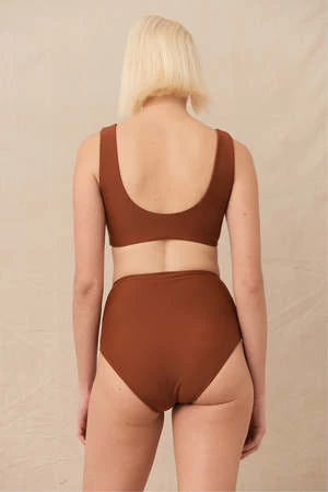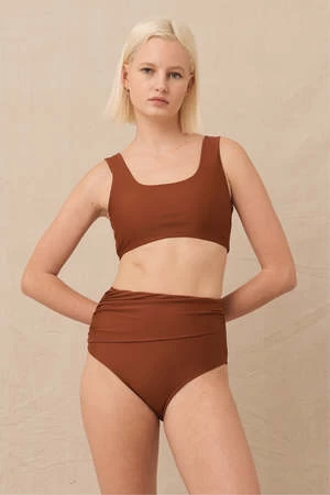 The Myrta high waisted bottom is a modest alternative to the Santiago Bottom, with a full coverage behind and gathered ruched front panel detail. Designed to stay in place in the surf and contour your curves in the sun.
