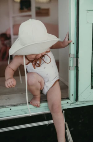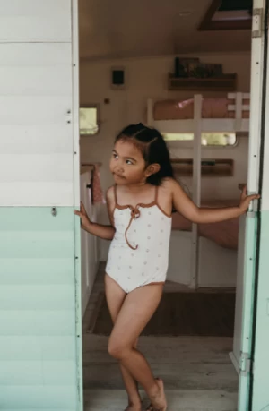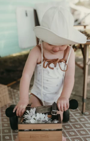 Our staple Lulu one-piece is a must have this season for your little girls summer adventures, in a beautiful creamy nude tone, a subtle peace print and contrast trim on a matte finish fabric, this Lulu suit really is the perfect fit for all the neutral lovers and skin tones . The suit is completely adjustable through the straps allowing for a long wear as they grow.
