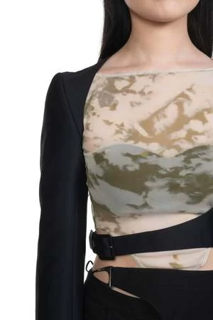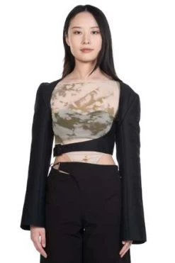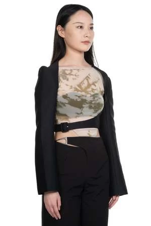 OUDE WAAG strikes a balance between Asian aesthetics and Western cutting. It is at the heart of designers philosophy: celebrating the power of women, yet simultaneously critiquing the ongoing objectification and idealisation of the body as you can see in the Waist Tie Deconstructed Jacket.