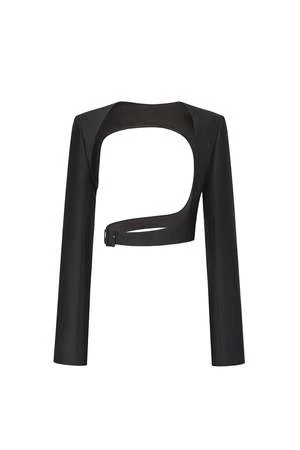 The tie-waist deconstructed sleeves are made of imported wool blend fabric, which has a smooth touch and subtle sheen. The streamlined design emphasising the upper body’s curves; the bold backless design with adjustable denim buckle waist belt is chic and casual, accommodating more circumferences.