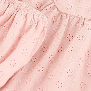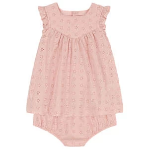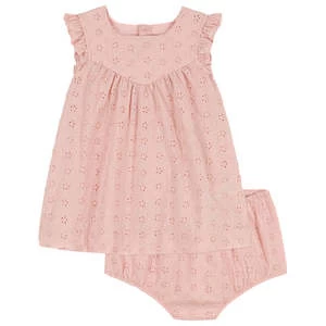 – Dress with button closure down the back, a gathered skirt and ruffle sleeves