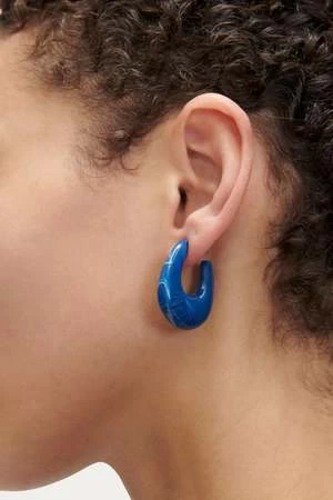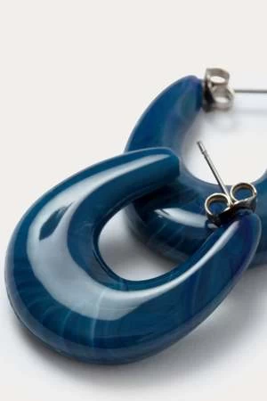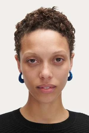 Rachel Comey Isle Earrings in Indigo are mini chunky Acrylic open hoop earrings with a hinged fastening for pierced ears. Sold as a set.