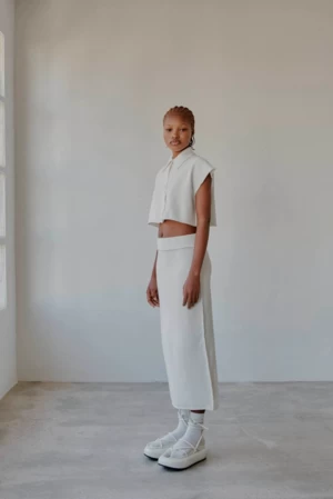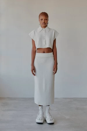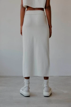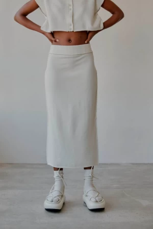 Midi skirt crafted from a soft and lightweight extrafine wool blend with a felted effect. Straight fit with a ribbed elasticated waistband with a rolled trim.