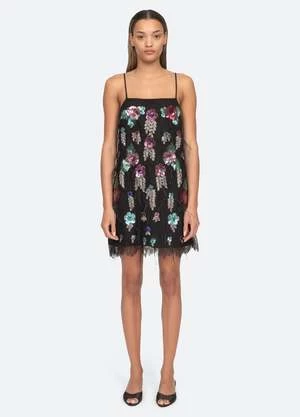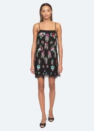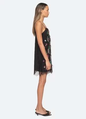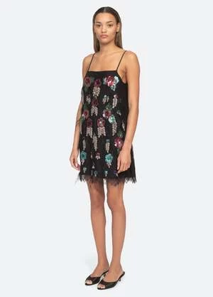 The Bethany lace slip dress is accented with floral sequin appliques, beaded detailing and feathers.