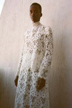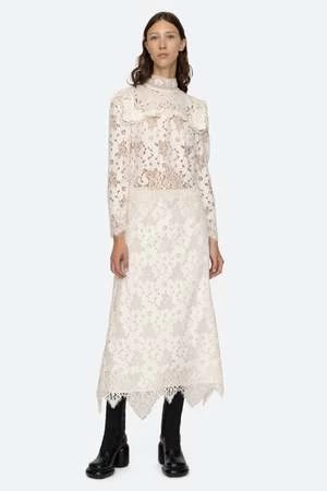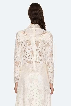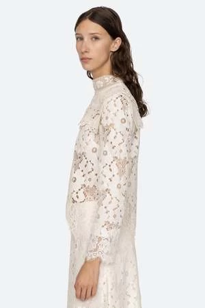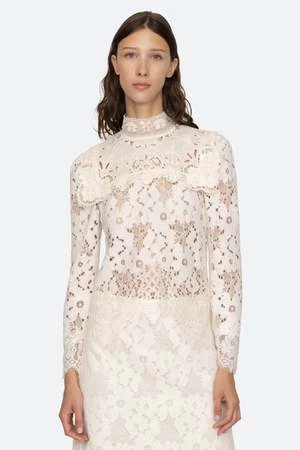 The Dalia lace top features a high neckline, long sleeves, intricate floral lace detailing throughout and scalloped hemline and cuffs. The lace bib features an antique colored lace.