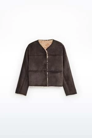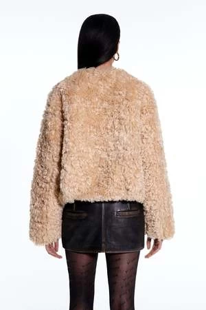 A reversible short jacket crafted in curly faux shearling, the Charmaine Jacket from Stand Studio has a faux suede reverse and snap closure. Shaped to a relaxed silhouette, this collarless, cocoon style jacket has two looks in one. Slit pockets are accessible from either side.