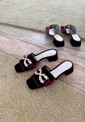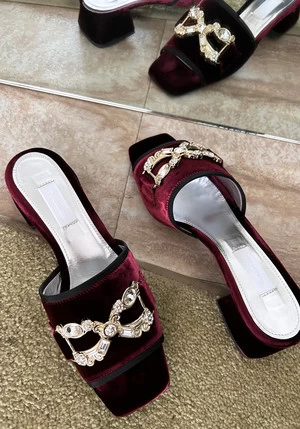 Low heeledslide sandal in velvet with grosgrain trim and pavé bow. velvet wrapped 1″ block heel. Gold leatherlining and italian leather soles.