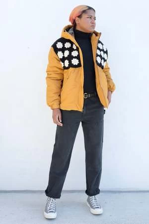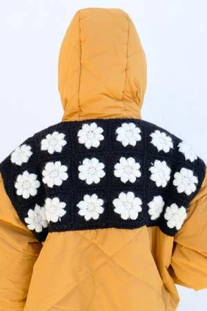 Padded quilted floral nylon jacket featuring a crochet flowers knit design on the top, coated zip closure and side pockets.
